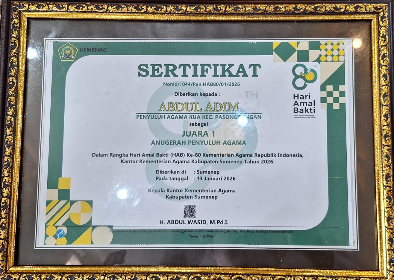 ”Saya sangat bangga. Semoga prestasi Gus Abdul Adim Yasin ini memantik api semangat bagi penyuluh lain di KUA Pasongsongan untuk berlomba-lomba menebar manfaat,” tutur Kyai Sadik.